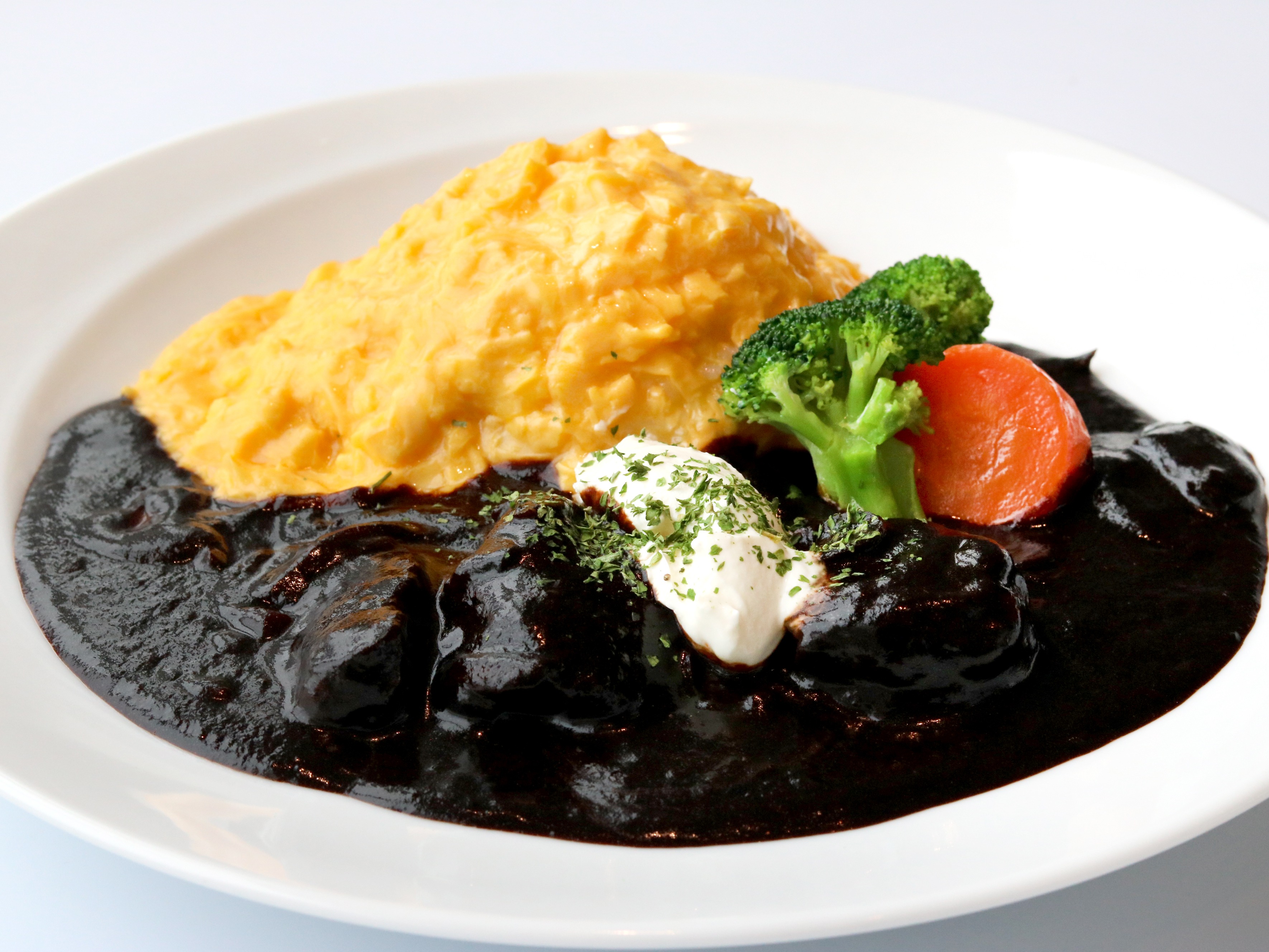 ふんわりとろける半熟卵で包み込んだ白米ライスのオムライスに、コク深く煮込んだハッシュドビーフを贅沢に添えました。