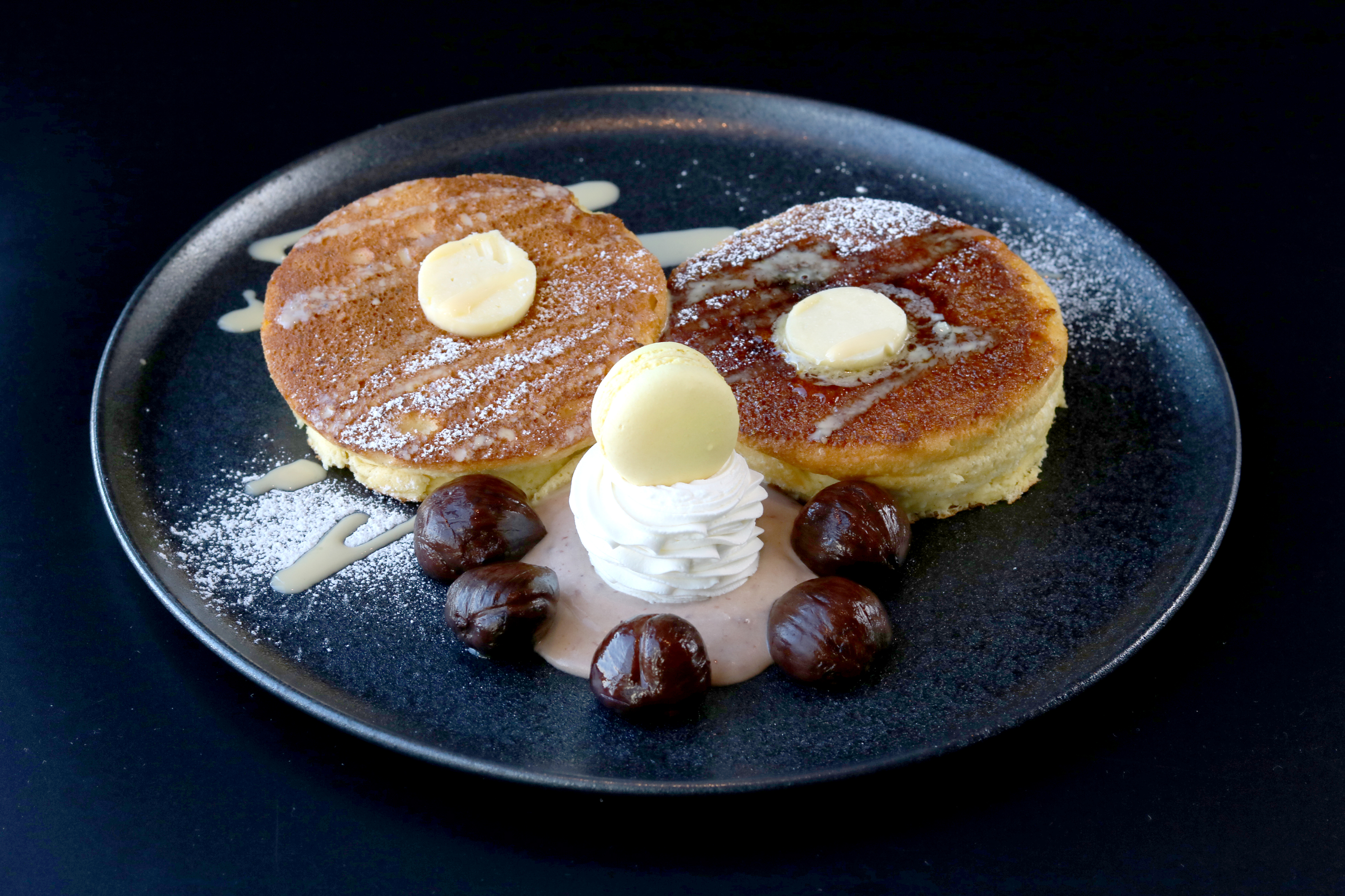 ふわふわのスフレのようにじっくりと焼き上げたパンケーキに、渋川栗と甘さ控えめのホイップクリーム、マカロンとともにお愉しみください。